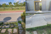 가을 들어 계속된 태풍들로 인해 구미천을 따라 설치해 둔 산책도로 옆 경계석과 땅이 움푹 파였다. 원지교 밑 산책도로의 무너진 경계석과 움푹 패인 땅...