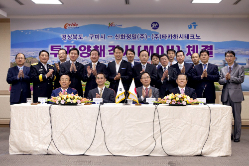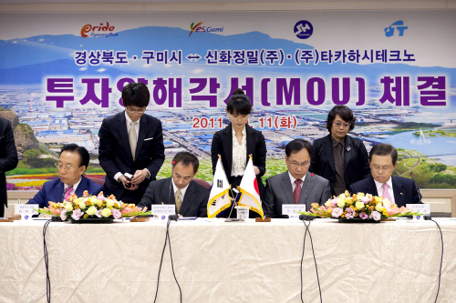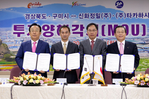 김관용 경상북도지사와 남유진 구미시장, 조승현 신화정밀 대표, 타카하시 야스히사 타카하시테크노 대표는 11일 구미시청 3층 상황실에서 4자간 투자양해각서(MOU)를 체결했다.