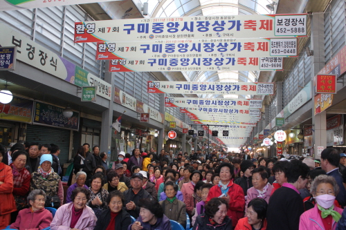 장용웅 구미중앙시장상인연합회장은 “대형할인마트에 대한 불평보다 의식의 변화와 감동을 줄 수 있는 친절을 베풀고 신선한 상품과 정확한 원산지 표시로 신뢰를 줄 수 있는 시스템을 구축한다면 어떠한 어려움도 극복 할 수 있을 것”이라며“지난 추석부터 온누리 상품권의 유입으로 인해 IMF 이후 매출이 증가되고 있는 현상은 전통시장에 미래와 희망을 보여주고 있다.”고 말했다.