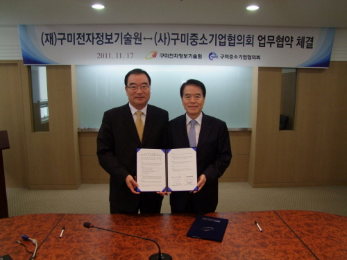 (사)구미중소기업협의회(회장 신창호)와 구미전자정보기술원(안병화)은 17일 구미전자정보기술원 대회의실에서 상호 긴밀한 협력시스템 구축과 공동발전을 위한 양해각서(MOU)를 체결했다.