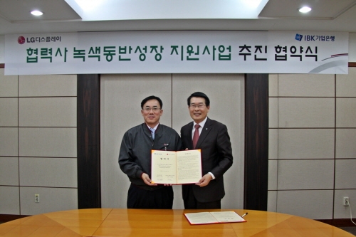 LG디스플레이 협력사들의 그린경영 실천을 위해 LG디스플레이와 IBK기업은행이 14일 LG 구미 공장에서 협력사 녹색동반성장 지원사업협약을 체결했다.