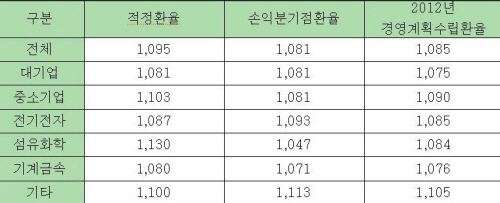 구미상공회의소(회장 김용창)가 2011년 12월 1일부터 12월 16일까지 지역 내 50개 수출업체들을 대상으로 적정 환율, 손익분기점환율, 2012년 경영계획 수립환율을 조사한 결과 지역 수출업체들이 2011년 12월 현재 설정하고 있는 적정 환율은 1,095원, 손익분기점환율은 1,081원, 2012년 경영계획 수립환율은 1,085원으로 2011년 대비 3원 하락한 것으로 나타났다.