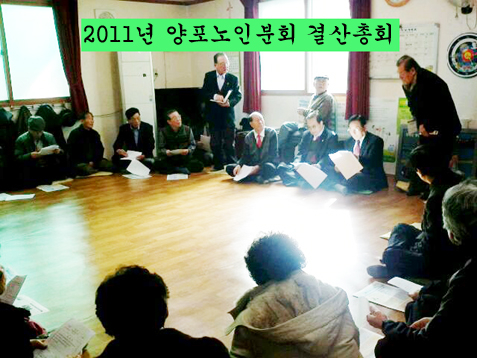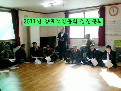 2011년도 구미시 양포동 노인새마을 봉사단 결산 및 감사보고, 양포동 노인 분회 결산총회가 지난 7일 분회 사무실에서 열렸다.김태환 국회의원, 전성호 양포동 사무소 주민생활 지원계장, 조근숙 주무관과 양포동 지역 각 경로당 임원진등 50여명이 참석한 가운데 열린 총회에서 김태환 국회의원은 격려사를 통해 " 혹한에도 불구하고 자리에 함께하신 어르신들께서 노인 새마을 봉사단 활동상황과 2012년도 기획에 대해 신중한 검토와 토론을 하시고, 양포동 지역발전을 위해 머래를 맞대시는 모습이 진심으로 존경스럽다"면서 "존체 건승하신 가운데 지역발전을 위한 정신적 지주로서 훌륭하신 조언을 부턱드린다"고 말했다.