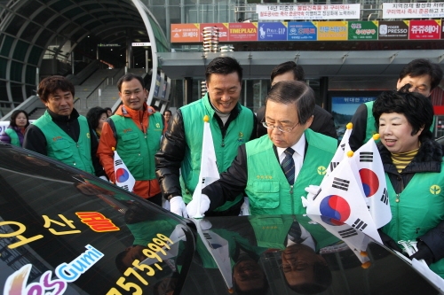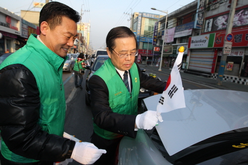 ▶남유진 시장이 시민들과 함께 태극기 달기 캠페인을 하고 있다.