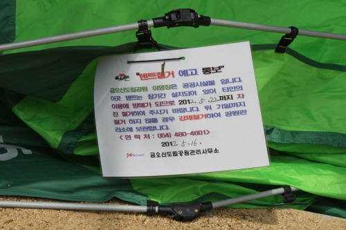 소중한 휴양시설인 금오산 야영장에 장기간 텐트가 설치돼 있으나 이를 단속할 근거인 조례제정이 지연되면서 구미시민들이 불편을 겪고 있다.지난 해 12월 건설도시국 행정사무감사에서 의원들은 야영장 운영 조례 제정보류 등이 원인으로 작용, 야영장에 불법 텐트설치가 극성을 부리는가하면 전기까지 무단 사용하면서 논란이 일자 김재상 의원등은 조례내용을 보완과 함께 상가 번영회와 협의를 거쳐 2012년 성수기 전에는 조례가 제정될수 있도록 하라고 요구했다. 그렇지만 성수기인 5월말 현재까지도 조례 제정을 미적거리면서 야영장 운영에 차질을 빚게하고 있는 것이다.