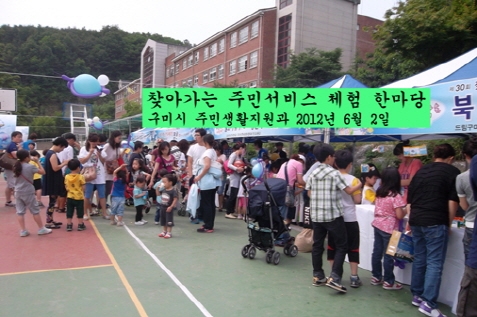 구미시와 드림네트워크(상임대표 윤영길)가 2일 옥계동 한울 공원에서 지역 영유아와 부모, 주민서비스 관련 기관과 단체, 기업체 봉사단 등 500여명이 참여한 가운데 <2012년 찾아가는 주민서비스 영유아 문화체험 한마당>을 개최했다.