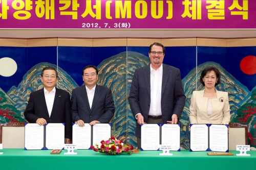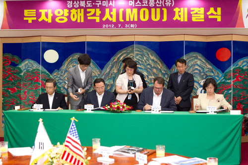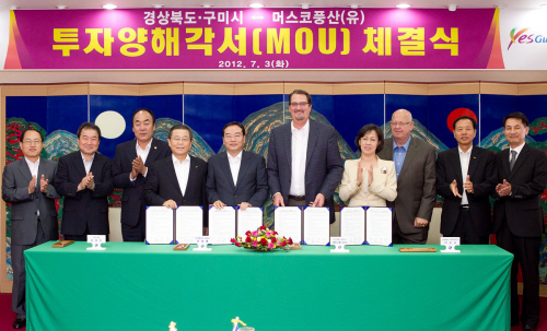 3일 구미시청 국제통상협력실에서 양해각서(MOU)를 체결식에는 이인선 경북도지사 , 남유진 구미시장, 미국 머스코월드 제프리에이로저스 사장, 안동훈 머스코풍산 대표이사 및 주요 임원이 참석했다.