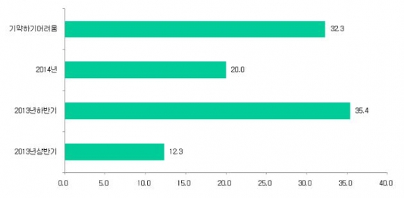 설문결과 다소부진(39.2%), 그저 그렇다(24.3%), 불황(23.0%), 호조인편(12.2%), 호황(1.4%) 순으로 응답했다. 또 경기가 그저그렇거나 별로좋지 않다고 응답한 경우 회복되는 시기는 2013년 하반기가 35.4%로 가장 높았다. 이어 기약하기 어려움(32.3%), 2014년(20.0%), 2013년 상반기(12.3%) 순으로 나타났다.