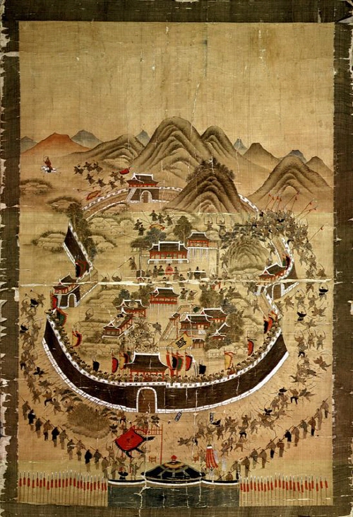 동래부순절도 그림 가운데에 중성(中城)에서, 하늘 높이 솟은 것은 객관(客舘)이며, 홍포(紅袍)에 오모(烏帽)를 쓰고 뜰에서 북향하여 몸을 굽히고 있는 것이, 동래부사 송상현(宋象賢) 공이 조용히 의리를 위해 죽음을 맞이하는 모습이다.