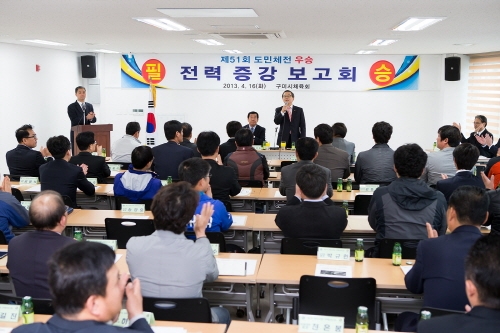 구미시는 16일 구미시체육회관에서 제51회 도민체전 우승을 위한 전력증강 보고회를 가졌다.