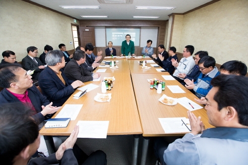 구미테크노밸리협동조합 이시우 이사장 등 기업대표 14명이 참석한 가운데 주)영우정공 회의실에서 열린 간담회에서 남유진 시장은 인사말을 통해 기업하기 좋은 환경으로 훌륭하게 조성해 준 한국산업단지공단 박찬득 대경권본부장과 기업인의 노고에 감 사 인사를 전했다.