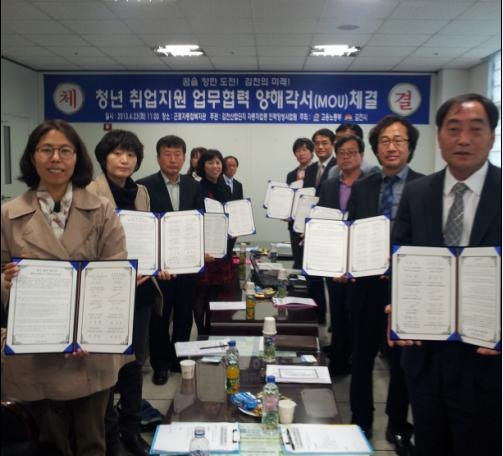 구미고용노동지청은 23일 김천시 근로자종합복지관에서 김천지역 대학 및 특성화고교, 김천시, 김천산업단지 자동차업종 인력양성팀 등 8개 기관과 김천지역 자동차업종 청년취업지원 업무협약을 체결했다.