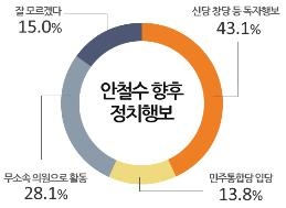 여론조사 전문기관 모노리서치(대표 이형수)가 지난 4월 25일 성인남녀 1,070명을 대상으로 안철수 의원 관련 전국 여론조사를 실시한 결과 안 당선자의 향후 정치 활동으로 43.1%가 '신당 창당 등 독자행보'를 지목했다. 이어 28.1%가 '무소속 활동', 13.8%가 '민주통합당 입당' 순이었다. '잘 모름'은 15.0%였다.