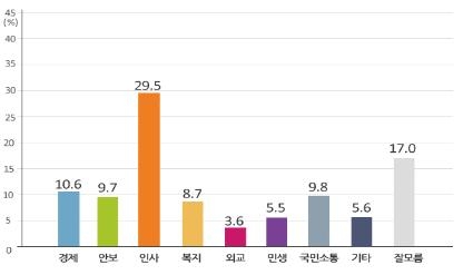 잘 못한 국정운영 분야로는 29.5%가 ‘인사’를 손꼽았다. 이어 10.6%가 ‘경제’, 9.8%가 ‘국민소통’, 9.7%가 ‘안보’, 8.7%가 '복지‘, 5.5%가 ’민생‘, 3.6%가 ’외교‘ 순으로 답했다. ’기타‘는 5.6%, ’잘 모름‘은 17.0%였다.