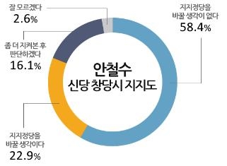여론조사 전문기관 모노리서치(대표 이형수)가 지난 5월 29일 전국 성인남녀 1,101명을 대상으로 안철수 신당 창당 시 안철수 신당 지지 여부를 묻는 조사를 실시한 결과 58.4%가 ‘지지정당을 바꿀 생각이 없다’, 22.9%가 ‘지지정당을 바꿀 생각이다’, 16.1%가 ‘좀 더 지켜본 후 판단’, 2.6%가 ‘잘 모름’이라고 응답했다.