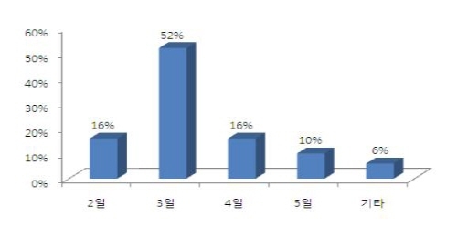 토요일과 일요일을 제외한 평균 휴가일수는 3일로 나타났으며 92%업체에서 전년대비 휴가기간이 동일하다고, 8%는 늘어났다고 밝혔으며, 하계휴가 연월차 대체유무는 82%가 대체하지 않는다고 답했고 나머지 18%만이 대체한다고 응답했다.