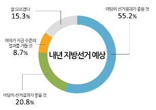 내년 6월 치러질 지방선거 결과에 대해 여론조사 대상 유권자 과반이 여당의 선전과 우세를 전망했다. 또 현 시점에서 어느 당에 투표할지를 묻는 질문에도 새누리당이 과반의 지지를 얻고 있었다. 현직 시장 및 도지사가 재출마 할 경우 지지하겠다는 유권자는 열 명 중 한명에 불과한 것으로 나타났다.