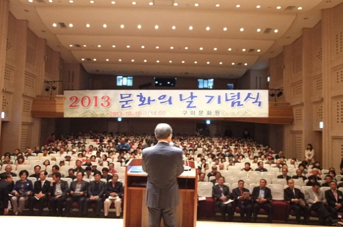 2013 문화의 날 기념식이 지난 18일 선산문화회관 대강당에서 열렸다. 이날 행사에는 남유진 구미시장, 임춘구 의회 의장, 박두호 노인회 구미지부 회장, 12개 분원장과 회원등 500여명이 참석했다.