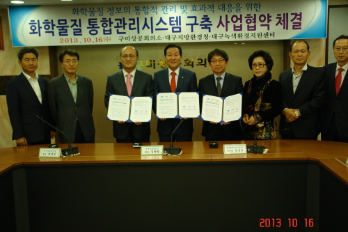 대구지방환경청(청장 최흥진)과 구미상공회의소(회장 김용창), 대구녹색환경지원센터(센터장 정응호)는 16일 구미상공회이소에서 구미지역 화학사고 예방 및 대응 강화를 위한 구미산단 화학물질 통합관리시스템 구축협약을 체결했다.