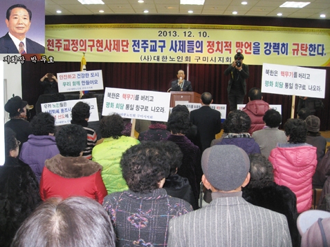 천주교 전주교구 사제단이 국가 정보원 대선 개입 의혹과 관련한 시국미사를 통해 박근혜 대통령에 대해 사퇴요구를 하고 나서자, 정치권과 교계가 술렁이고 있는 가운데 대한 노인회 구미시지회 (지회장 박두호)가 규탄궐기 대회를 가졌다.