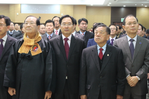 박두호 노인회 구미시지회 회장(왼쪽)과 김교승 전 구미문화원장(오른쪽) 중간에 이재웅 전 경상북도 도지사 비서실장이 서 있다. 꼬옥 담은 입술, 결연한 의지를 읽을수 있다.