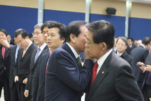 ▶김용창 구미상공회의소 회장이 김태환 국회의원에게 귓속말을 하고 있다. 그 내용이 궁금하다