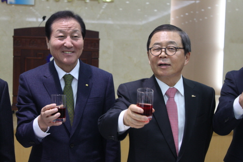 ▶남 유진 시장과 김용창 회장이 건배잔을 들고 있다. 한때는 저 웃음을 나누며 친구의 우정을 다지기도 했으나