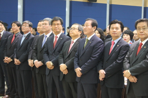 ▶ 남유진 시장, 김용창 회장, 심학봉 국회의원, 김태환 국회의원이 정면을 응시하고 있다.