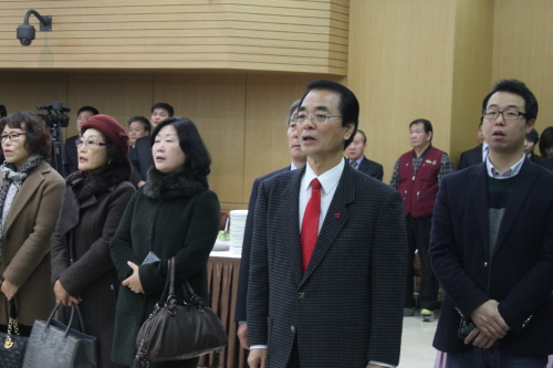 ▶ 행사장 뒷줄에 자리를 하고 선 채동익 공동대표, 세번쩨 시장 선거에 나서고 있다. 걸어온 세월이 힘들었던 탓일까. 고독한 표정이 역력하다.