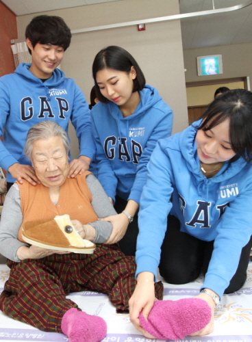 구미대학교(총장 정창주) 홍보대사 ‘키우미’ 학생들이 설을 앞둔 28일 구미시립노인요양병원(병원장 이택근)을 찾아 털실내화와 수면양말을 전달하며 손자, 손녀의 따뜻한 온정을 함께 나누었다.