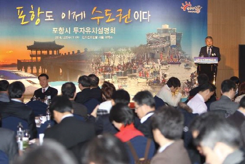 포항시는 1월22일 서울 코엑스 인터콘티넨탈 호텔에서 이름만 대면 알만한 100여 개의 중견기업을 비롯해 부동산투자전문가와 재경 출향기업인 등 약 300여 명과 30여 언론취재진이 참석한 가운데 대규모 투자유치 설명회를 개최했다.
