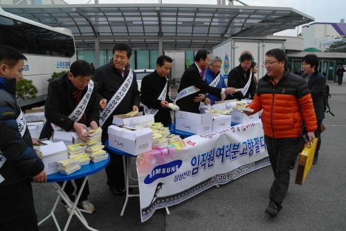 떡 전달은 삼성전자가 최근 지역에 소외된 이웃들에게 나누어 주기 위해 필요한 치약과 비누, 떡국용 떡 등 1억 2천만원 상당의 물품을 구미중앙시장 상인들로 부터 구입한 것에 대한 감사의 표시로 마련됐다.