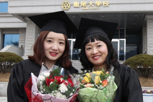 6일 구미대학교(총장 정창주) 긍지관 대강당에서 열린 제21회 학위수여식에서 모녀가 동기동창으로 나란히 학사모를 써 화제다.
