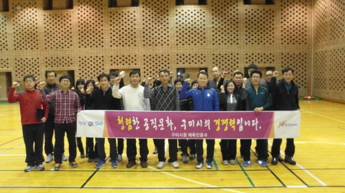 구미시 체육진흥과(과장 신정순)는 6일 오후 6시 박정희체육관 지하 보조경기장에서 전직원이 참석한 가운데 청렴 실천 및 소통을 위한 청렴실천 다짐 직원 체육대회를 가졌다.