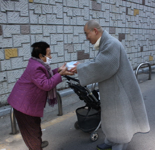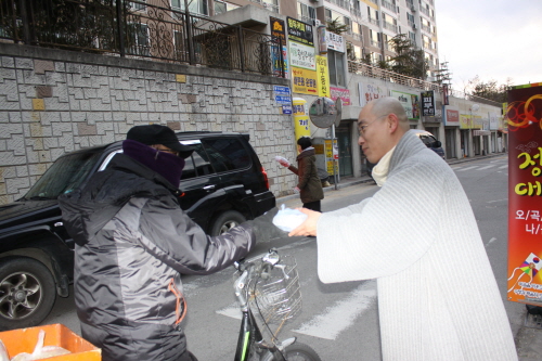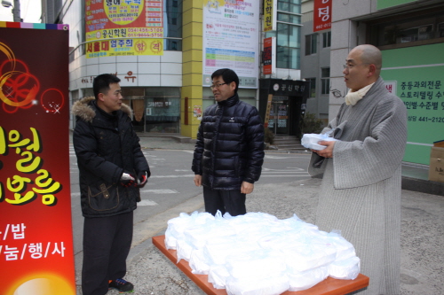 용담 주지 스님과 신도들은 아침7시부터 봉곡동의 영남네오빌과 세양청마루, 코아루 앞 길목에서 출근하는 주민들에게 오곡밥과 나물을 전했다.