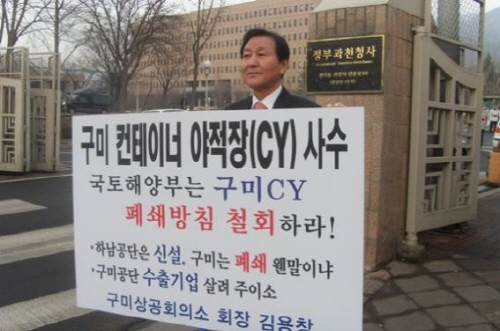 구미상의는 또 “ 김용창 회장은 취임 후 5년 동안 철도CY 존치를 위한 활동을 추진해 왔으며, 지난 11년 2월 국회와 국토 해양부 앞에서 1인 피켓시위까지 벌이기도 했다.”고 밝혔다.