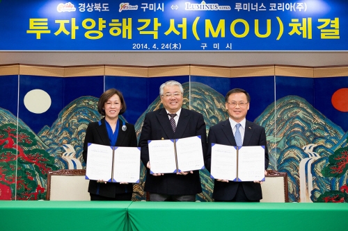 경북도와 구미시가 24일 시청에서 루미너스코리아의 구미 부품소재전용산업단지에 외국인직접투자 5백만불 등 총 100억원 규모의 신규이전공장건립 투자 양해각서(MOU)를 체결했다.