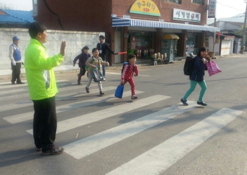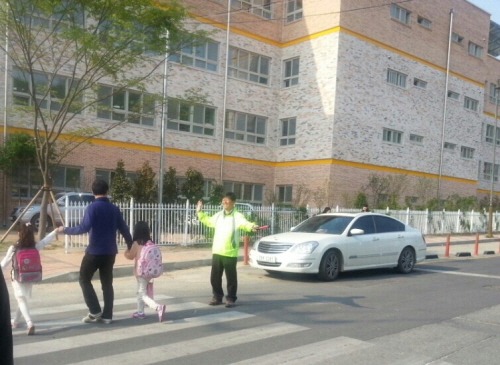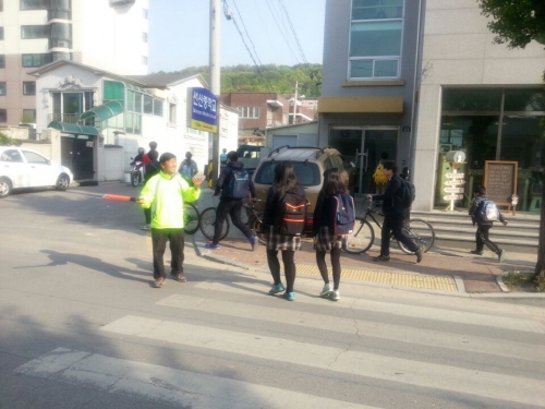양진오 전 선산초등학교 운영위원회 위원장이 24일 아침 새롭게 단장한 선산초등학교에서 등굣길 교통지도에 나섰다.