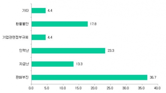 기업경영애로요인으로는 판매부진 36.7%, 인력난 23.3%, 환율불안 17.8%, 자금난 13.3%, 기업관련 정부규제 4.4% , 기타 4.4% 순으로 나타났다. 기타의견으로는 경쟁심화, 거래선 해외생산 가속화(국내제조감소), 업황부진, 납품단가 인하 등이었다.