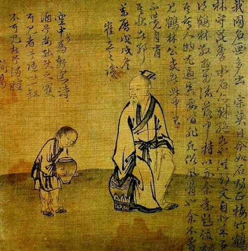 동자가 허리를 굽혀 받쳐 들고 있는 술 항아리를, 돈(墩)에 앉아서 바라보고 있는 학창의(鶴氅衣) 차림의, 선비를 묘사한 이 그림에는 최립(崔岦)이 1598년(선조 31) 겨울에 달필로 쓴 발문과, 찬시가 배경 없이 비어있는 화면의 여백을 빽빽이 채우며 적혀있다. 발문을 보면 이 그림을 포함한 9점의 그림들이 흩어져 있다가, 성천부사를 지낸 홍준(洪遵)에 의해 수집되었다는 사실과 그려진 인물들이 비범하고 속기가 없어 보여, 작가인 이경윤을 만나본 적은 없지만, 이 인물들 속에 혹시 자기도 모르게 표현된 작가 자신의 모습이 깃들어 있을지도 모른다는 내용이 담겨 있음을 알 수 있다. 인물들의 자연스런 모습과 단아한 표정도 훌륭하지만, 옷 주름의 필선 또한 매우 능숙하고 유연하다. 의습선의 필치는 굵고 가는 선폭의 변화를 특징으로 하는, 중국 당나라 화가 오도자 계열의 전통을 바탕으로 전개된, 남송 때 화가 마원(馬遠) 이래의 궐두묘(獗頭描)를 받아들여 이를 보다 세련되게 사용하였다. 앉아있는 선비의 오른쪽 하체 부분에 보이는 먹선의 농도가 급격히 떨어져 있어 다소 어색한 느낌을 주기는 하나, 전반적으로 높은 격조를 보인다.