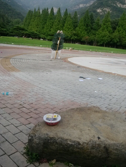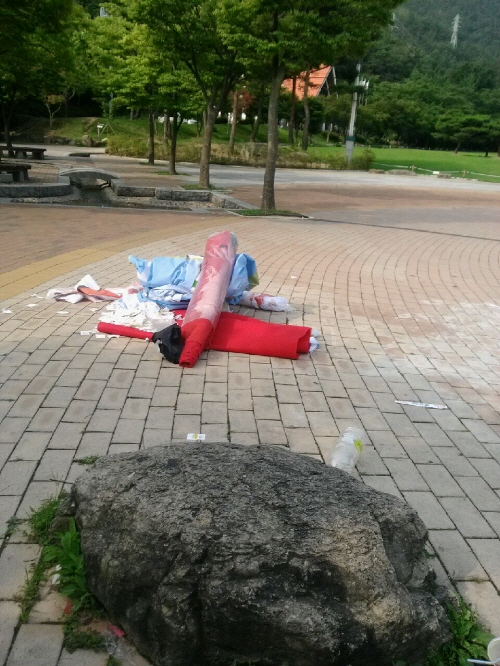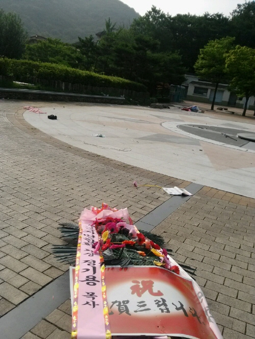 ☛19일 저녁 행사 다음 날인 오전 8시 30분, 축하 화환이 내동뎅이쳐 있고, 멀리 보이는 곳에 쓰레기들이 널부러져 있다. 축하 화환을 보내온 이의 성의를 내동뎅이 친 격이다. 행사 뒷날 오전 내내 관광객들이 이 모습을 보면서 혀를 내둘렀다./