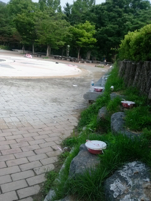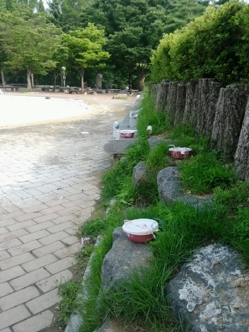 | ▶먹다버린 도시락과 음료수 통이 곳곳에 널부러져 있다 |