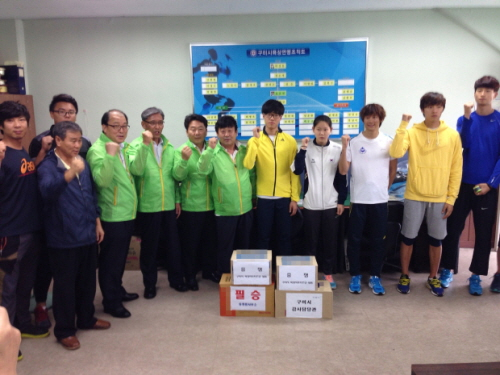 제52회 도민체전 구미시 육상 서포터즈단(단장 한국전력공사 구미지사장 배원학)및 정석광 감사담당관, 이대희 녹색정책담당관과 류시건 송정동장 일행은 지난 18일 구미시 육상선수단이 훈련중인 구미시민운동장을 찾아 격려금을 전달하고 도민체전 우승을 향해 맹훈련중인 선수을 격려했다.