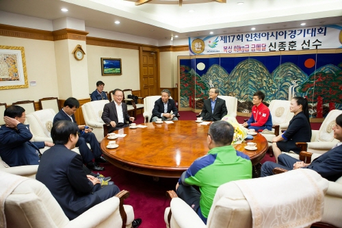 구미시는 10일 시청 국제통상협력실에서 2014 인천아시안게임 복싱 라이트 플라이급에서 금메달을 획득한 신종훈 선수를 초청해 격려했다.