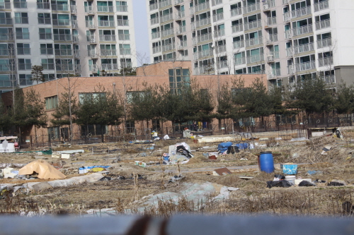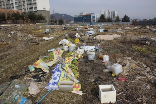 이로 인해 현재까지 학교부지가 방치돼 있는 실정이다. 이렇다보니 3천여평의 학교 부지가 불법경작지로 전락해 군데군데 시금치, 봄동, 파 등 채소가 심어져 있는가하면 곳곳에 플라스틱 통과 비료포대, 폐비닐 등 농자재들이 어지럽게 널부르져 있고 빈 패트병과 깡통 등 각종 쓰레기가 여기저기 나뒹구는 등 도시미관을 해치고 있다.
