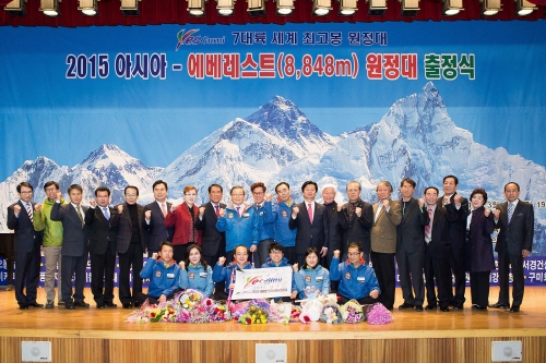 구미시와 구미시산악연맹(회장 최성모)은 지난 13일 구미시청 4층 대강당에서 “예스 구미, 2015 아시아-에베레스트(8,848m) 원정대(대장 장헌무) 출정식”을 남유진 구미시장, 최성모 구미시산악연맹 회장을 비롯한 심학봉 국회의원, 윤창욱 경북도의회 부의장, 김정숙 구미교육장, 시·도의원, 지역기관단체장, 대한산악연맹, 경북도연맹, 구미시연맹 임원·회원, 원정대원 등 500여 명이 대거 참석한 가운데 성황리에 개최했다.