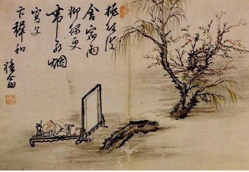 桃紅復含宿雨, 柳綠更帶朝煙. 寫與 卞穉和. 檀翁. 복사꽃 붉더니 간밤의 비 머금었고, 버들은 초록빛에 아침 안개 둘렀네. 변치화에게 그려주다. 단옹 김홍도