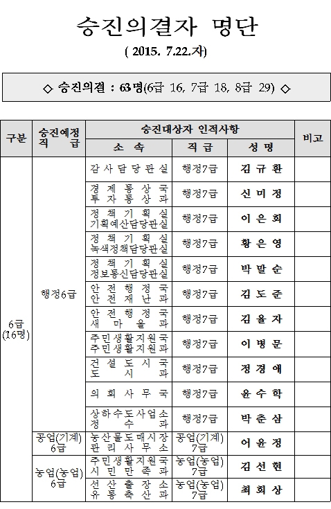 구미시가 7월 22일자로 6급 16명, 7급 18명, 8급 29명 등 총63명의 승진의결자 명단을 발표했다.