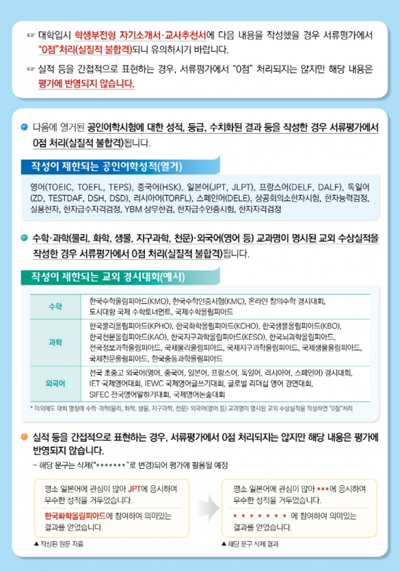 도 교육청은 수험생들이 학생부 전형에 필요한 자기소개서, 교사추천서 작성 때 0점 처리 및 불합격처리 관련 사항에 대해 각 고등학교와 수험생들의 주의를 당부했다. 특히 작성금지 대상 공인어학성적 유형을 안내하고, 이와 관련된 성적, 등급, 수치화된 결과를 기술할 경우 0점 처리된다고 밝혔다. 또 수학・과학(물리, 화학, 생물, 지구과학, 천문)・외국어 교과명이 명시된 외부 수상실적을 기재해 불합격처리 되는 일이 없도록 당부했다.