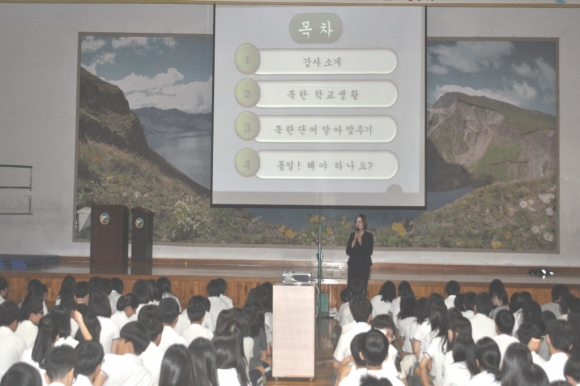 10일에는 1학년 학생을 대상으로 통일에 관심을 가질 수 있도록 ‘통일순회강좌’를 열었다. 강좌는 2002년 탈북해 정착한 김수연 강사를 초빙, 북한 주민 생활의 현실과 언어의 이질화에 대해 다양한 자료를 활용한 실감나는 내용으로 이뤄졌다.